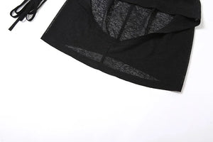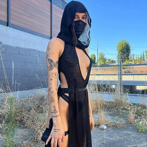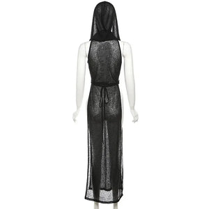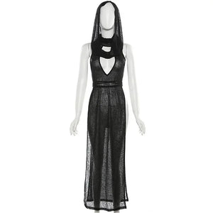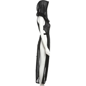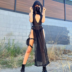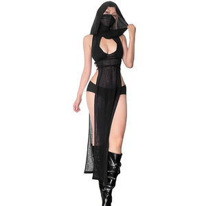 With its daring high-leg slits, flowing silhouette, and sultry sheer fabric, this outfit strikes the perfect balance between mystery and allure. The attached hood adds an enigmatic vibe, while the open-cut details frame your body in a way that’s both powerful and dangerously sexy.