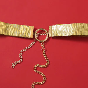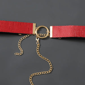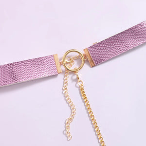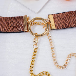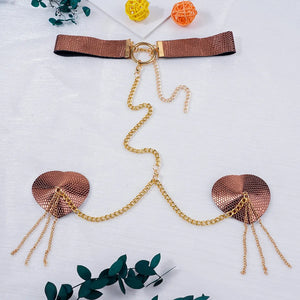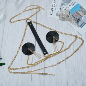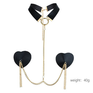 • 🔗 Gold-tone chain harness connects pasties to faux leather O-ring choker