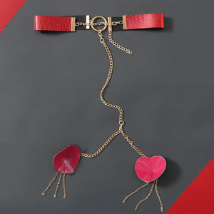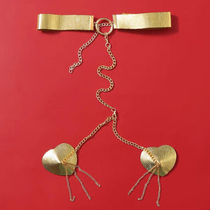 These black heart-shaped pasties are made from textured faux leather for a luxe, bold finish, and they adhere securely to your skin with gentle, skin-safe adhesive. The centerpiece? A gold chain that drapes seductively from a faux leather O-ring choker down to each pastie, with extra gold fringe for added shimmer and movement. It’s playful, provocative, and impossible to ignore.